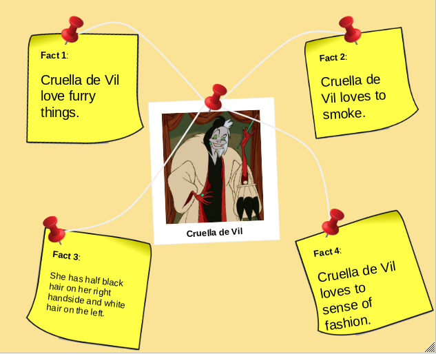 Cruell de Vil even has a sense of fashion. She even has 2 colours of hair. They are Black on the right hand side and White on the left hand side. She is also a devil woman and a witch and thinks she is the person ruling the world.